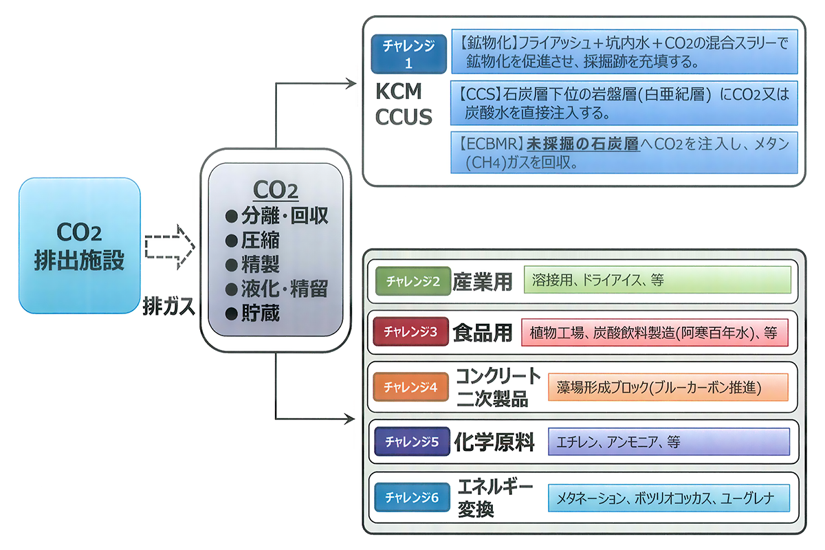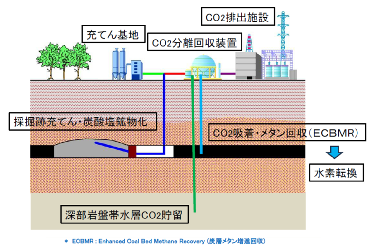 払い跡(石炭採掘跡)は、空気に触れて自然発火することを防止するため、鉱業法、鉱山保安法で密閉・充てんが義務付けられています。充てん剤として使用する石炭灰中の成分Ca、Mg等とCO2を反応させ鉱物化することで払い跡の充てん強度を高めるとともに、CO2が漏出しない安全で強固な密閉技術、集中監視技術を確立するため、研究所・大学の専門家・研究者の協力を得て実証試験に取り組んでいます。「石炭の利用」と「利用後のCO2削減」をセットで考え、炭鉱だからこそできる、環境負荷低減の新しい挑戦を進めています。